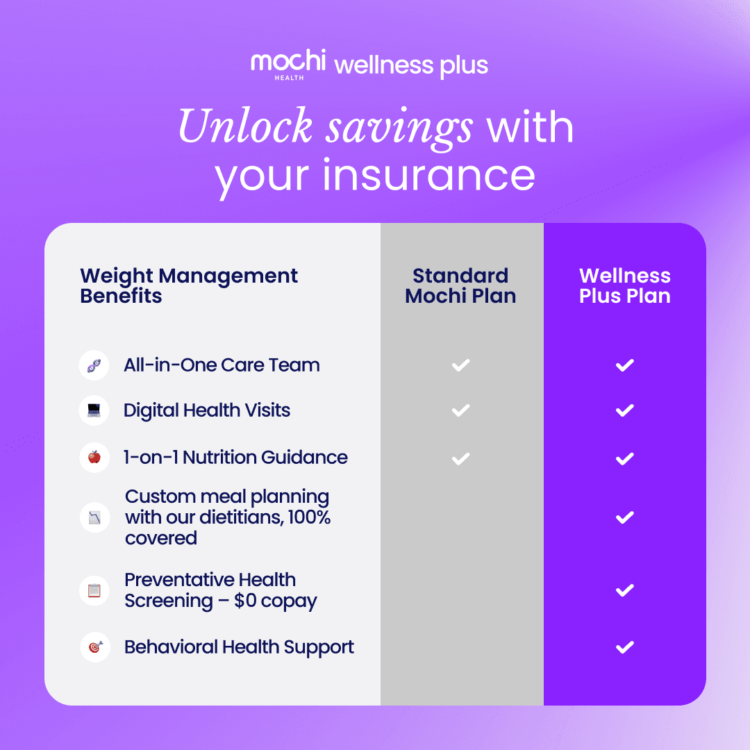 At Mochi Health, we are dedicated to making weight care easy and affordable. Wellness Plus is our way of ensuring everyone can benefit from proactive care and utilize their insurance to bring costs down.