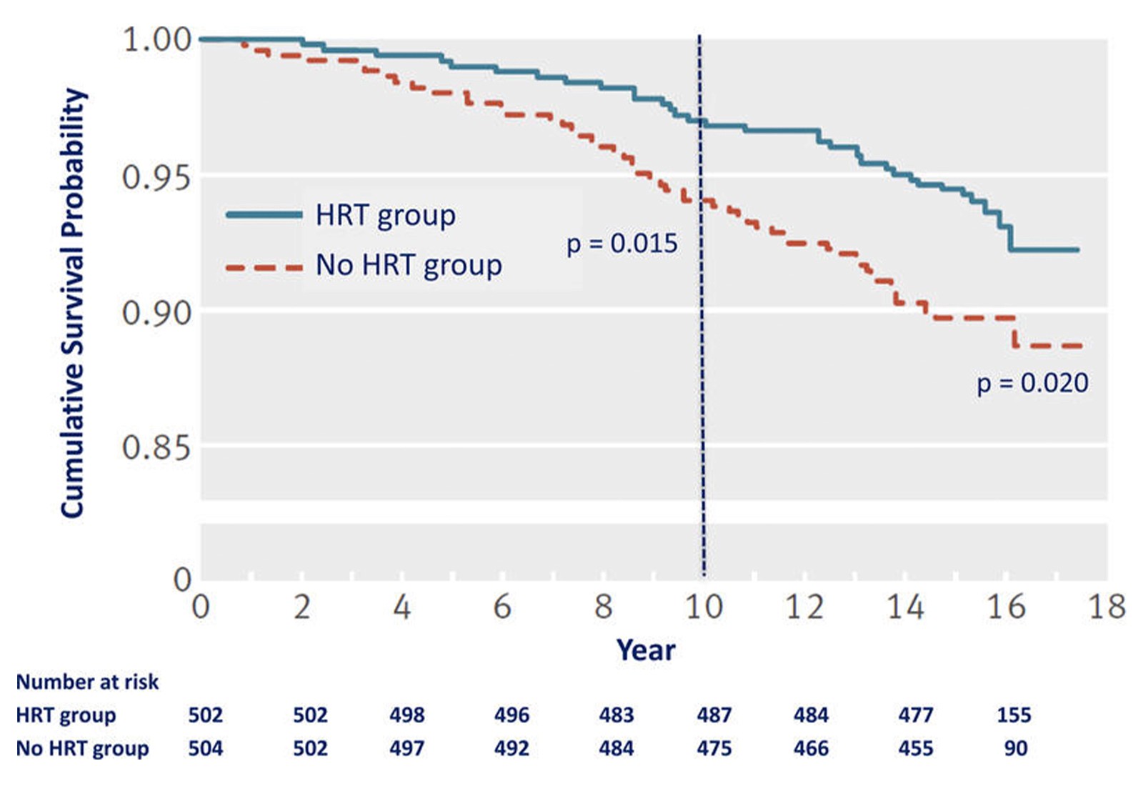 What this graph shows: The blue line represents women using HRT, while the red dashed line represents women not using HRT. Higher lines mean better survival rates. The separation between the lines demonstrates that women using HRT had consistently better survival throughout the study period. The vertical dashed line at year 10 marks an important milestone, and the p-values (0.015 and 0.020) indicate these differences are statistically significant, not due to chance.