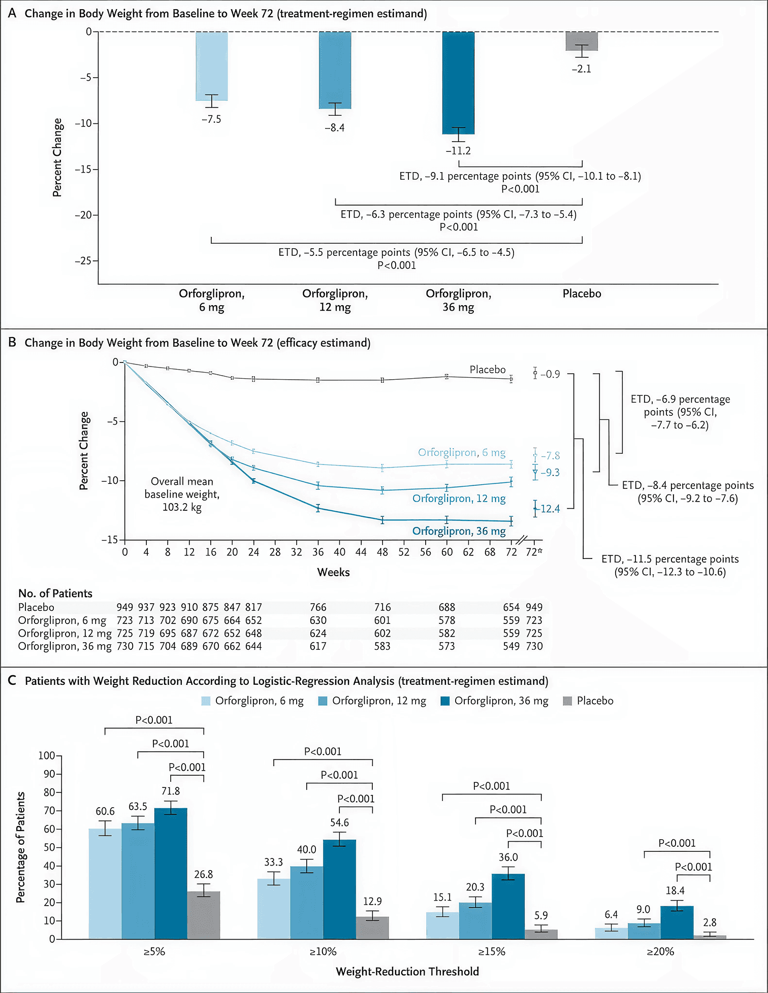2. Wharton, S., Aronne, L. J., Stefanski, A., Alfaris, N. F., Ciudin, A., Yokote, K., Halpern, B., Shukla, A. P., Zhou, C., Macpherson, L., Allen, S. E., Ahmad, N. N., & Klise, S. R. (2025). Orforglipron, an oral small-molecule GLP-1 receptor agonist for obesity treatment. New England Journal of Medicine, 393(18), 1796-1806. https://doi.org/10.1056/NEJMoa2511774